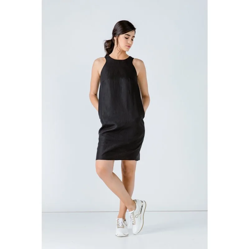 Zomerse zakjurk van zwart geweven linnen. Ronde hals en mouwloos. Darts op de borst en 2 steekzakken. Verborgen ritssluiting op de rug, toon op toon.Ons model is 172 cm en draagt maat 36/S. Afmetingen voor maat 36 (in cm): Schouder -28; Borst-45; Taille-50; Onderkant-52; Lichaamslengte-95. Losse pasvorm. 100% LINO