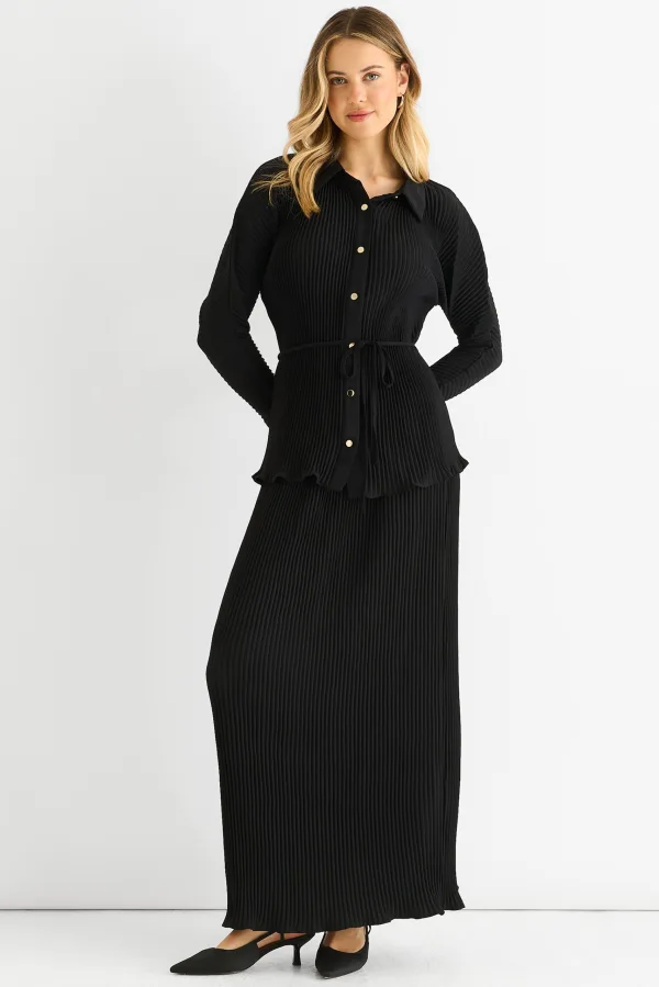 Denna svarta plisserade maxikjol har en bekväm elastisk midja för en enkel passform och en flödande silhuett som rör sig med dig. Det strukturerade plisserade tyget ger en subtil dimension, vilket gör den till ett djärvt men ändå enkelt val för avslappnade dagar eller kvällar. Kombinera den med dina favoritplagg för en mångsidig, stilren look som sätter komforten i centrum.
