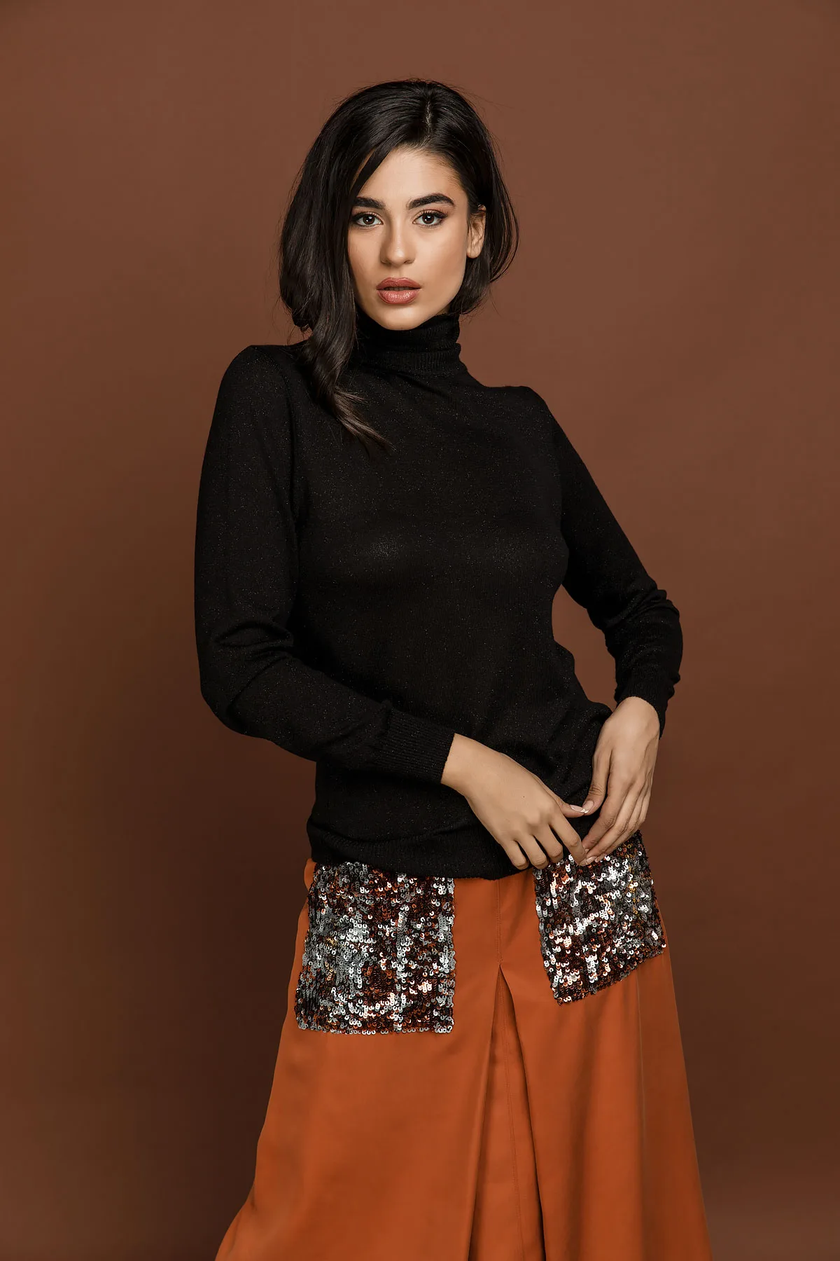 Gebreide coltrui in zwart. Lange mouwen met geribde boorden. Hoge geribde hals. Geribde zoom. Recht silhouet. Accessoires zijn niet inbegrepen. 80%viscose-11%polyamid-9%lurex. Ons model is 175 cm lang en draagt maat 36. Afmetingen voor maat 38/M (in cm):Schouderbreedte-40, Buste-50, Taille-47, Zoomlijn-36, Mouwen-65, Lichaamslengte-68.