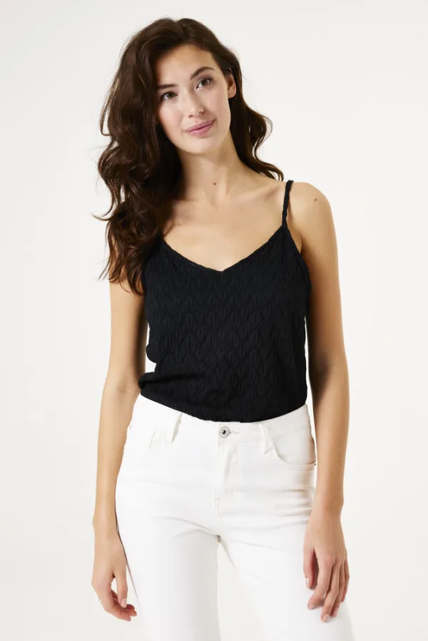 Singlet met structuur. Deze top is een fijne basic met een trendy touch. Deze singlet heeft spaghettibandjes, een V-hals en een regular fit. Dit item is gemaakt van 95% polyster en 5% elastaan.