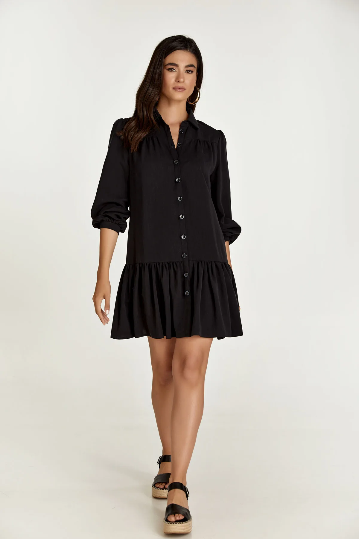 Deze zwarte jurk met lange mouwen is vervaardigd uit geweven tencel. Het heeft een kraag en een sluiting aan de voorzijde die wordt gesloten met decoratieve zwarte plastic knopen. De mouwen hebben manchetten van 3 cm die sluiten met een knoop. Op de schouders zitten plooien en 12 cm daaronder zit een naad met plooien. Op 30 cm van de zoom bevindt zich een naad met plooien.