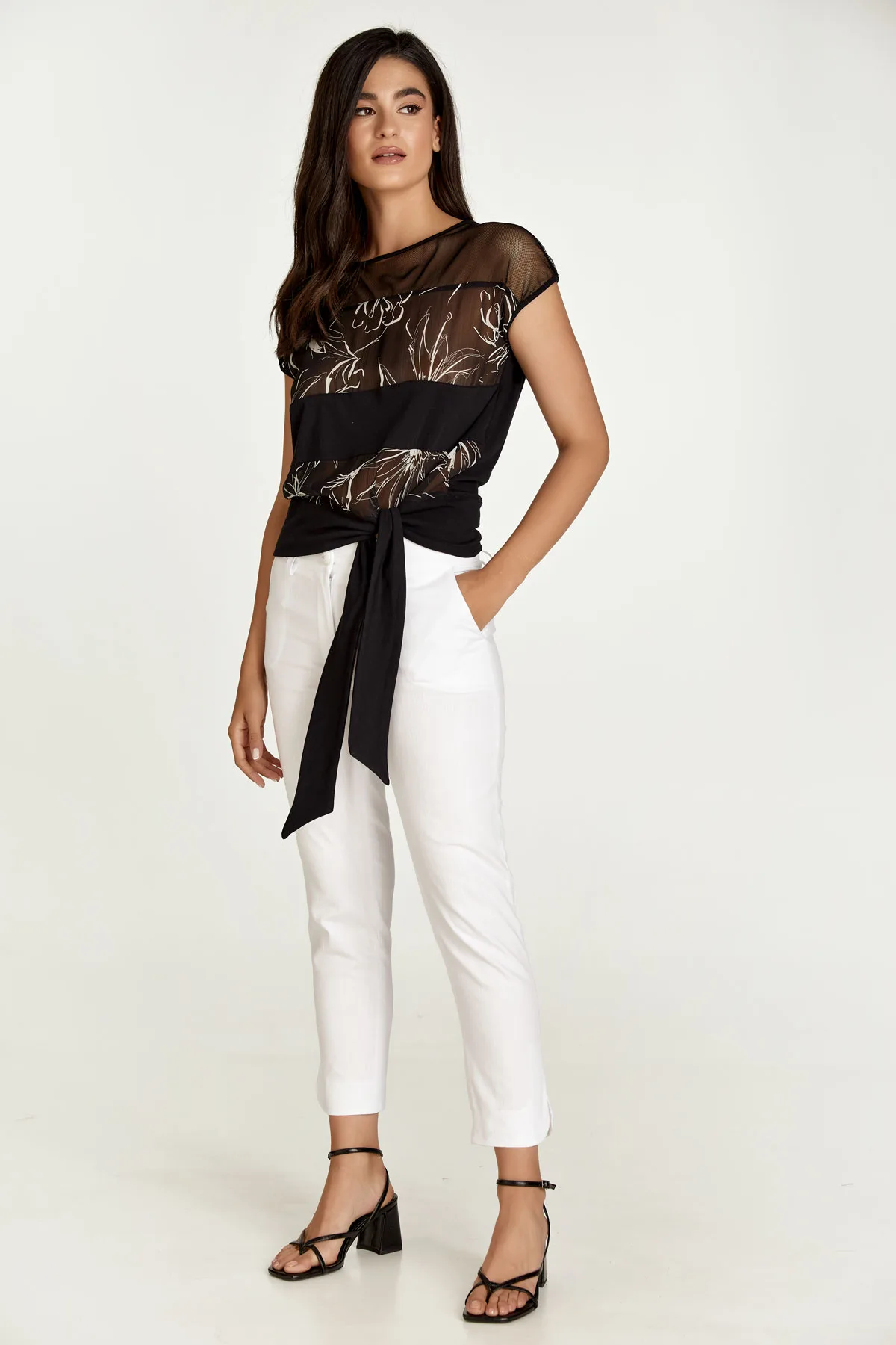 Deze mouwloze top heeft een ronde halslijn. De achterkant is van zwarte stretch tencel-elastaan stof. De voorkant heeft bovenaan een paneel van 11 cm in zwarte netstof. De middelste en onderste panelen zijn van zwarte stretch tencel-elastaan stof. De rest van de voorkant is van chiffonachtige stof met een abstracte bloemenprint en een subtiel wafeleffect. Links van de zoom loopt het paneel door, waardoor er bandjes ontstaan. Deze top heeft een relaxte pasvorm. Lichaamslengte voor maat 38: 59cm