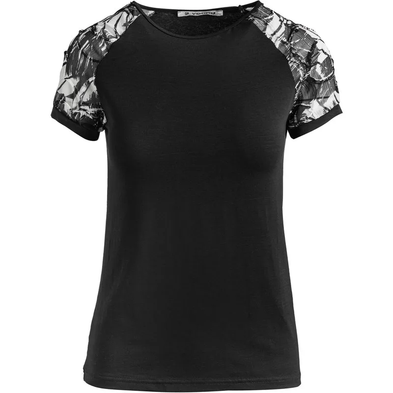 Zwarte stretch jersey top van viscose-elastane stof. Ronde halslijn met een bies van 0,5 cm in dezelfde stof. Korte raglanmouwen met zwarte bies aan de manchetten in dezelfde stof. Net jacquard contrast stof mouwen. Getailleerd silhouet.