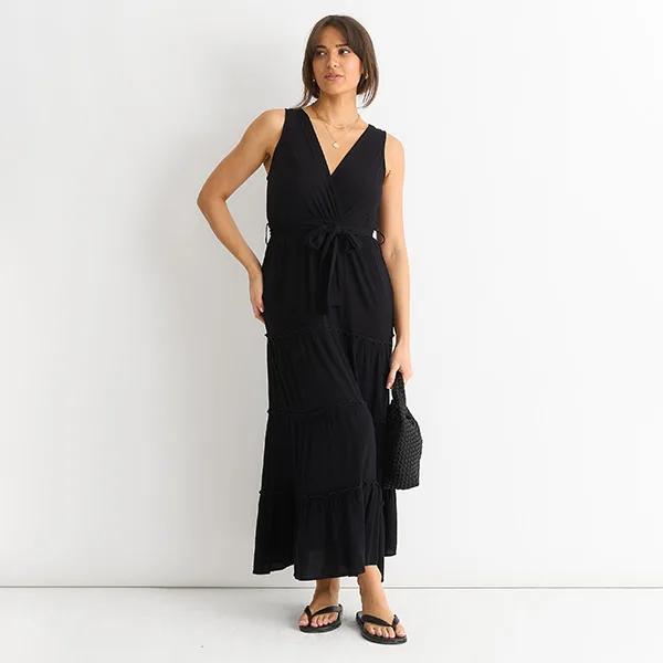Verhoog je stijl met onze zwarte Viscose Wrap Tiered Maxi Dress. Deze jurk is gemaakt van hoogwaardige viscose en heeft een flatterend wikkelontwerp en gelaagde lagen voor een verfijnde en elegante look. Deze jurk is perfect voor elke gelegenheid en geeft je een luxueus en exclusief gevoel.