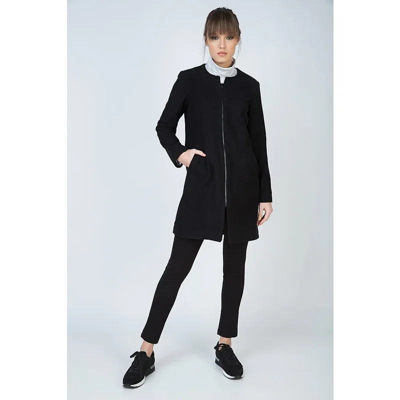 Zwarte winterjas met lange mouwen van geweven stof. Ronde hals. Sluiting aan de voorkant met een dikke zwarte plastic rits. 2 steekzakken. Recht silhouet. Volledig gevoerd in zwarte stof. Ons model is 178 cm lang en draagt maat 36. Afmetingen voor maat 38 (in cm):Buste-48; Lichaamslengte-87; Taille-48; Schouderbreedte-38; Zoomlijn-54,mouwen-60. Kledingstuk is losjes getailleerd.