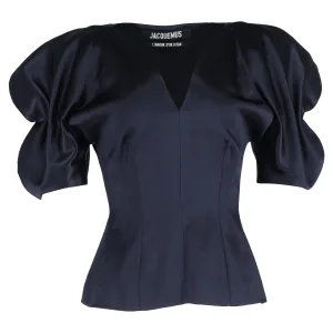 Jacquemus blouse met pofmouwen en V-hals in marineblauw satijn