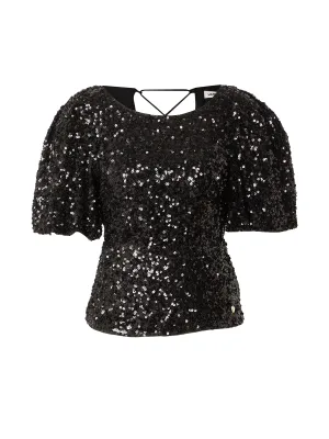 Paars fluwelen top met paillettenstrik aan de voorkant en pofmouwen