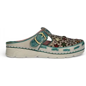Laura Vita Dorry 01 damessandalen met bloemenprint, blauwe leren sleehak.